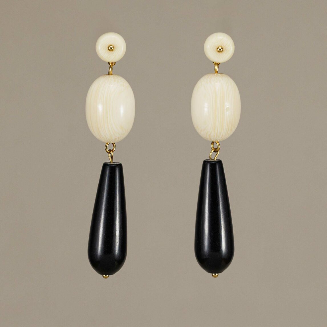 El toque final y distintivo es una lágrima negra que cuelga elegantemente al final del pendiente, aportando un contraste visual impactante y sofisticado. Esta combinación de tonos neutros con un detalle en negro hace que los Pendientes Hueso Amaya sean versátiles, perfectos para combinar con diferentes estilos y ocasiones, desde un look casual hasta un outfit más formal.