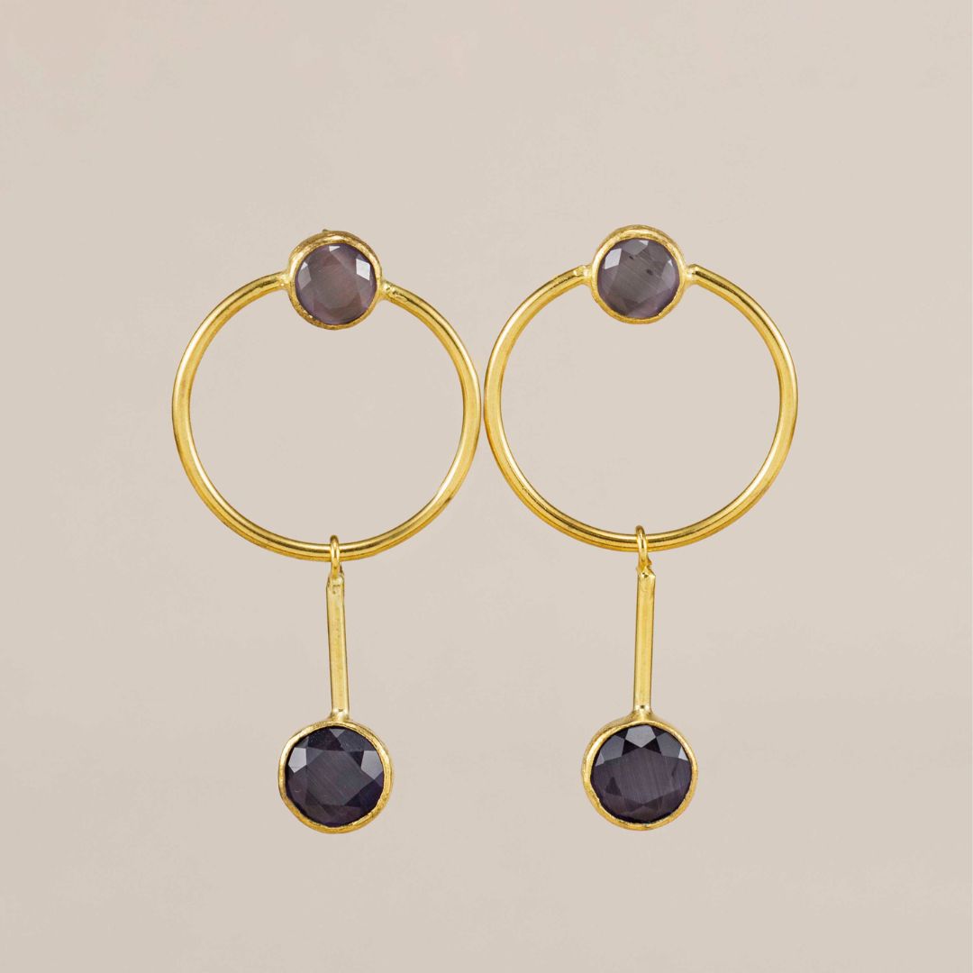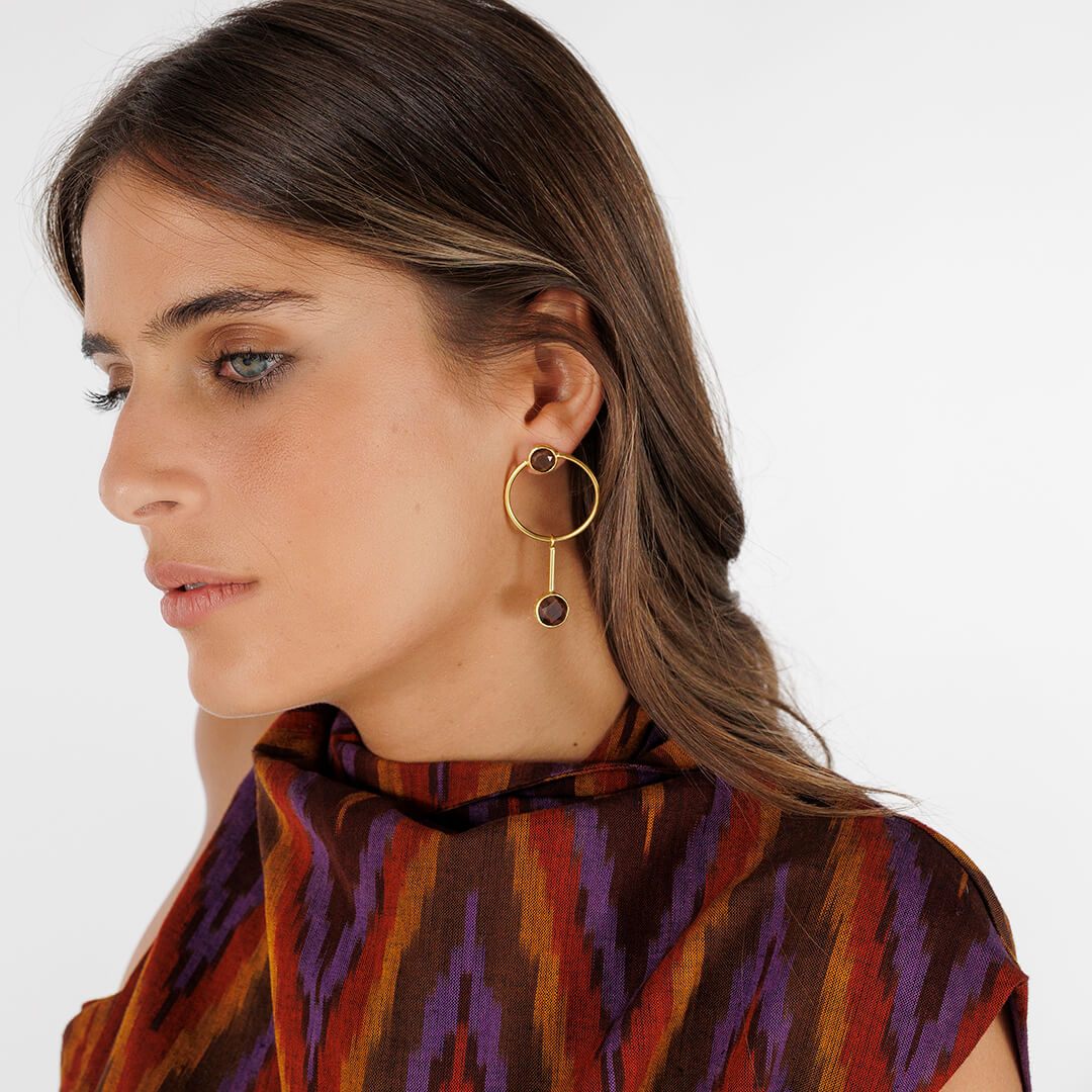Los Pendientes Carmina combinan la elegancia de las líneas doradas con el encanto de las piedras naturales. Su estructura está formada por una piedra redonda en forma marquesa que se sitúa en el lóbulo. Desde esta piedra parte un aro visto de frente, del cual cuelga una barra dorada que finaliza en otra piedra natural. Esta combinación de elementos aporta un equilibrio perfecto entre sofisticación y modernidad.