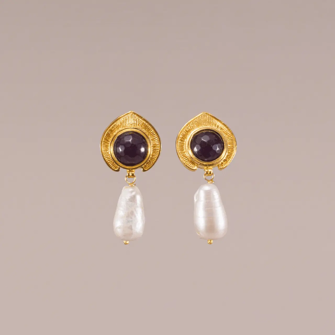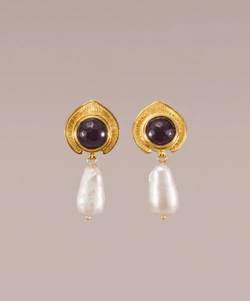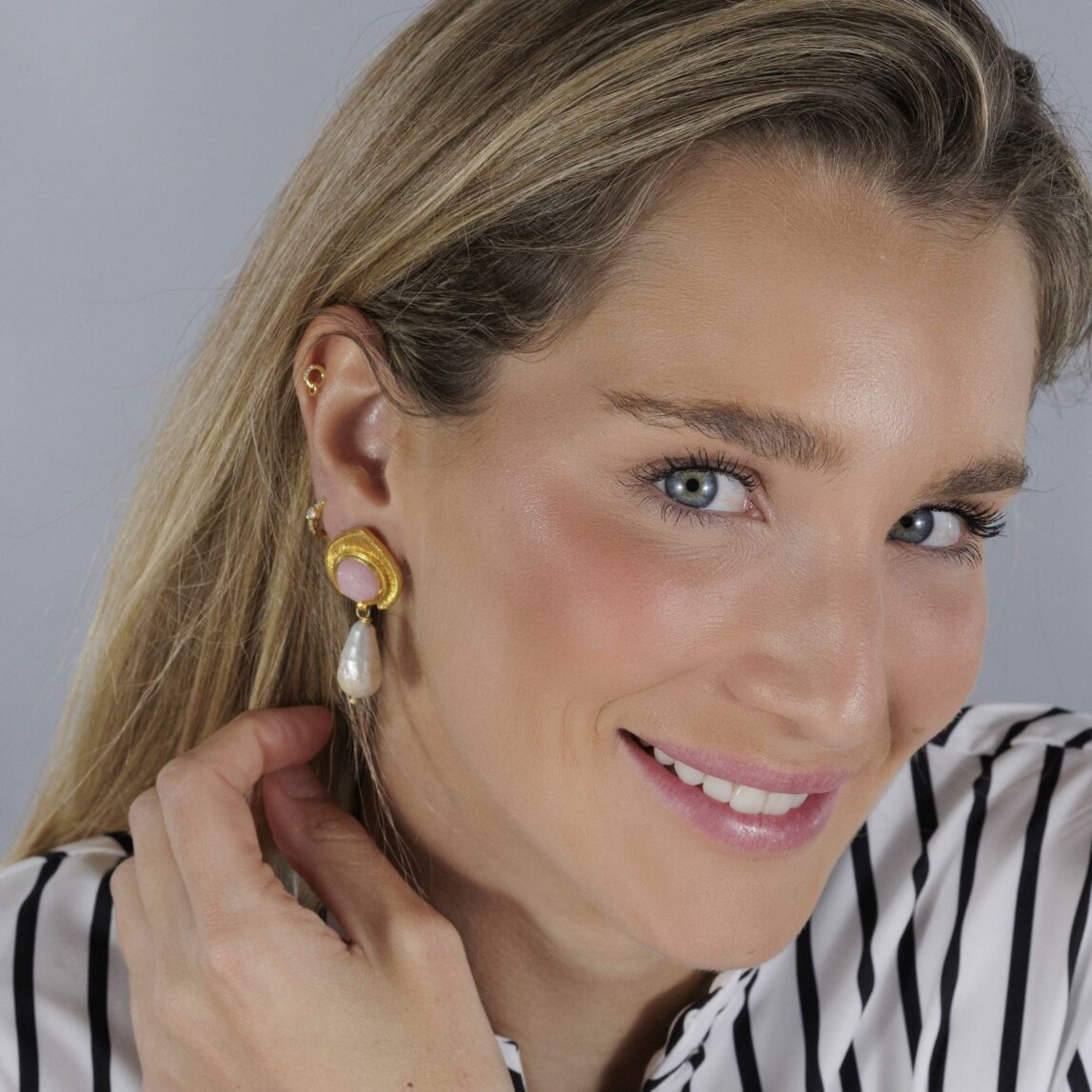 Los Pendientes invitada Mezquita serán amor a primera vista. Están fabricados en plata 925 con baño de oro y una piedra natural de ágata en distintos colores en la cabeza del pendiente; de la que cuelga una preciosa perla barroca de color blanco.