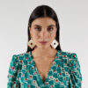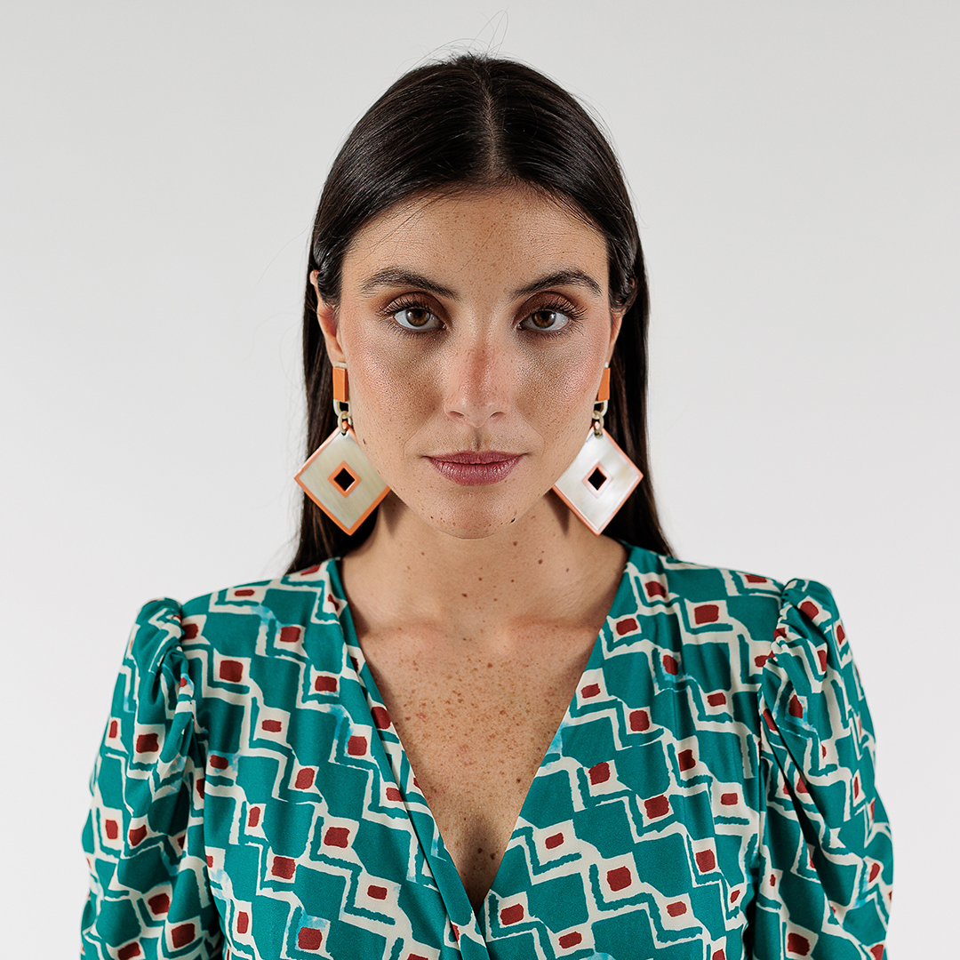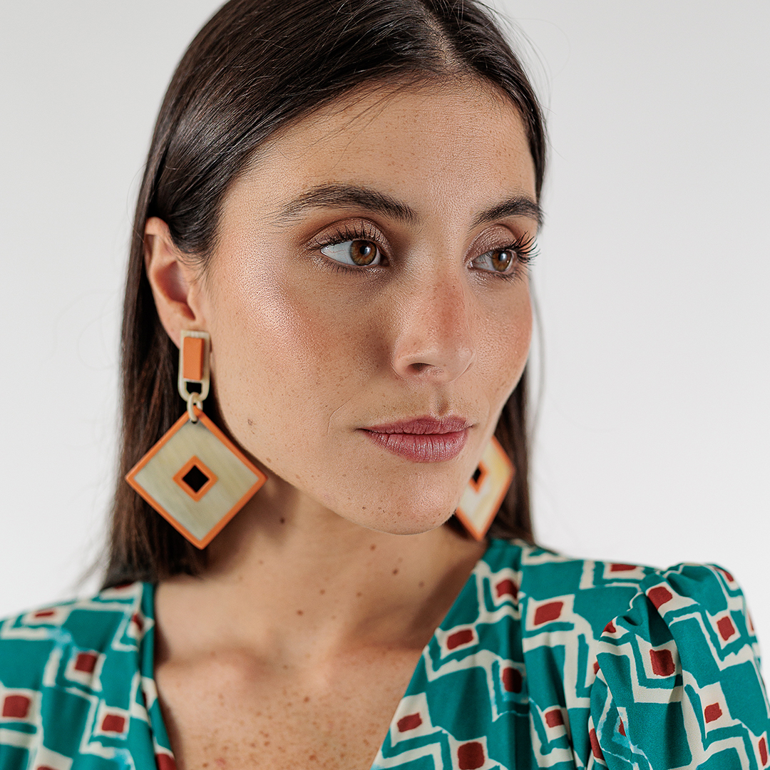 El diseño de los Pendientes Isabella no pasa desapercibido. En la parte superior, tienen un rectángulo en color marfil y mostaza del que cuelga un rombo hueco en los mismos colores. Están hechos de cuerno de búfalo, lo que no solo les da un aspecto único, sino que también los hace ligeros y cómodos de llevar, a pesar de su tamaño.