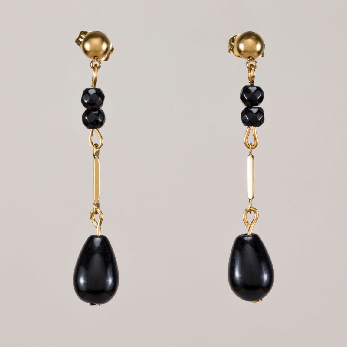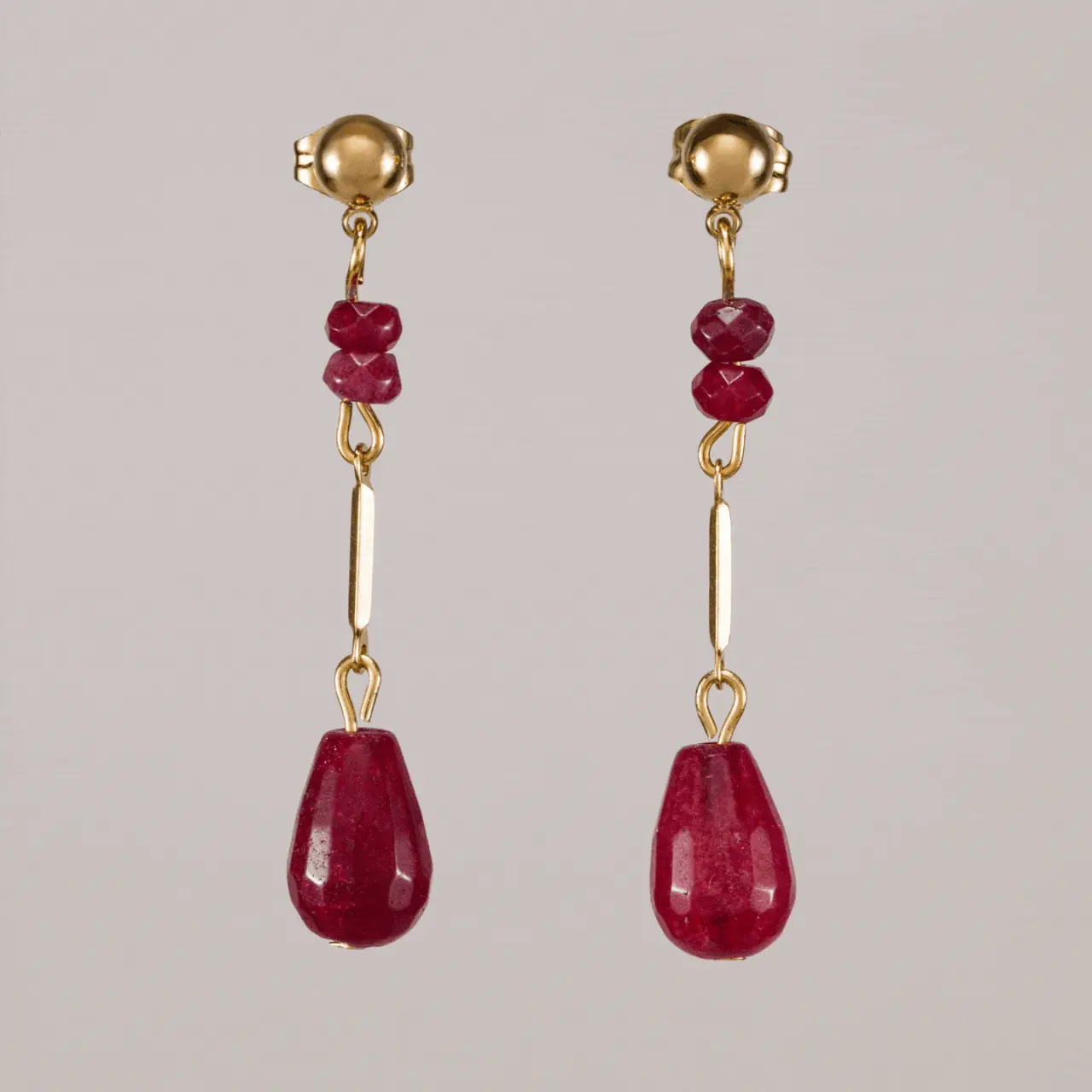 Los Pendientes Lacrima son joyas artesanales montadas a mano, fabricadas en acero inoxidable waterproof, hipoalergénicas y resistentes al agua para un uso diario sin preocupaciones. Su diseño combina una bolita dorada, piedras naturales facetadas y una barra rígida que termina en una lágrima de piedra, personalizable en varios colores como fresa, naranja, negro o rojo. Ligeros y cómodos con cierre de tuerca, son perfectos para cualquier ocasión especial y se pueden combinar con brazaletes y ropa de la colección para un look elegante y distinguido.