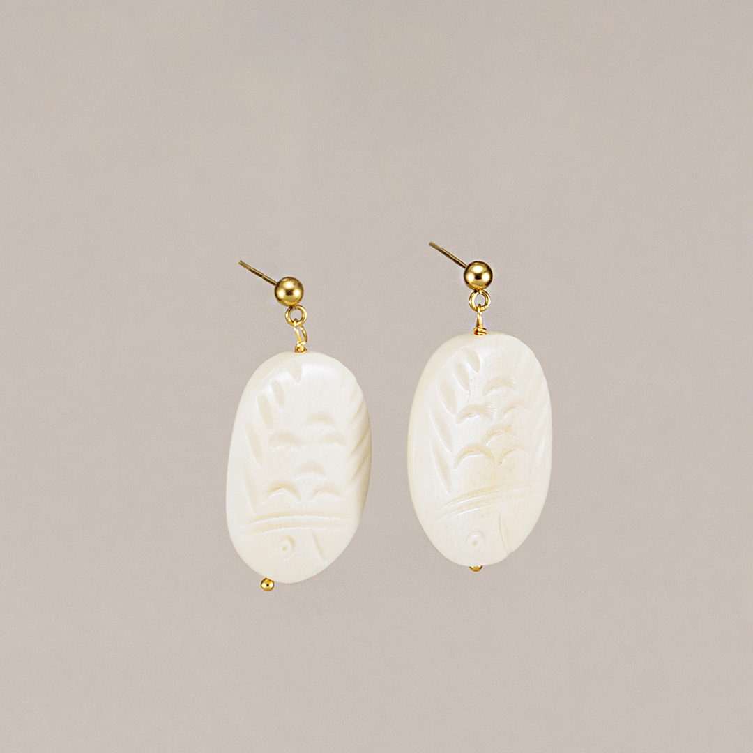 Los Pendientes Darla combinan acero inoxidable dorado con un pez tallado en asta color marfil. Artesanales, hipoalergénicos y llenos de estilo
