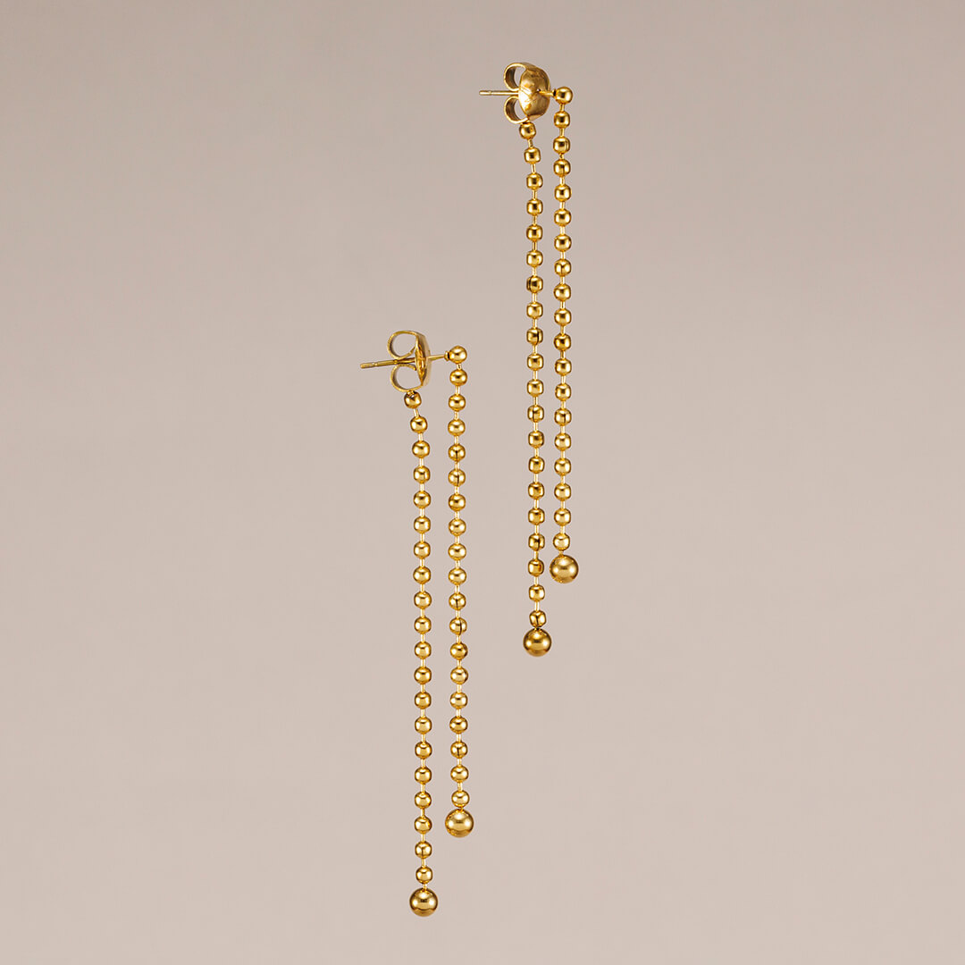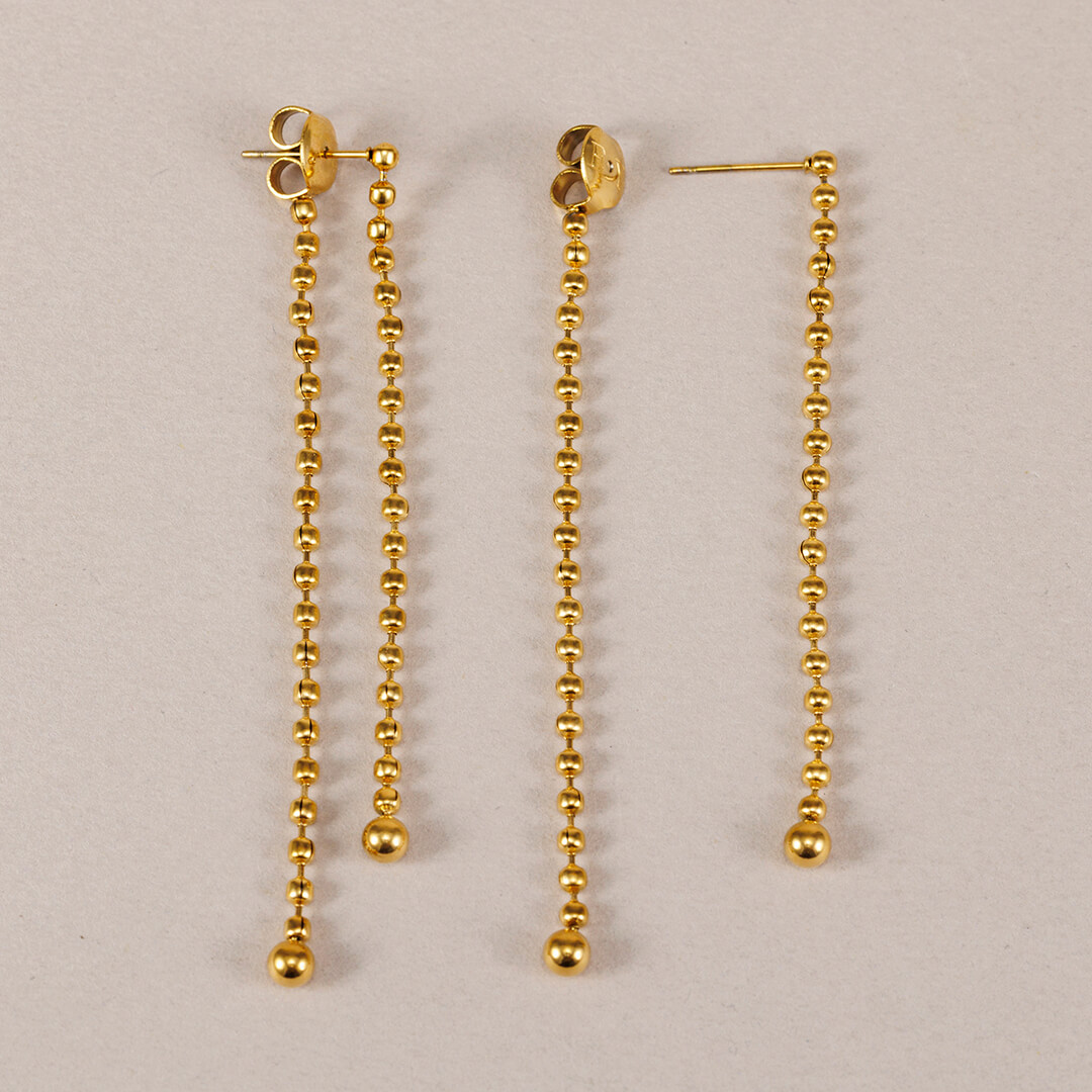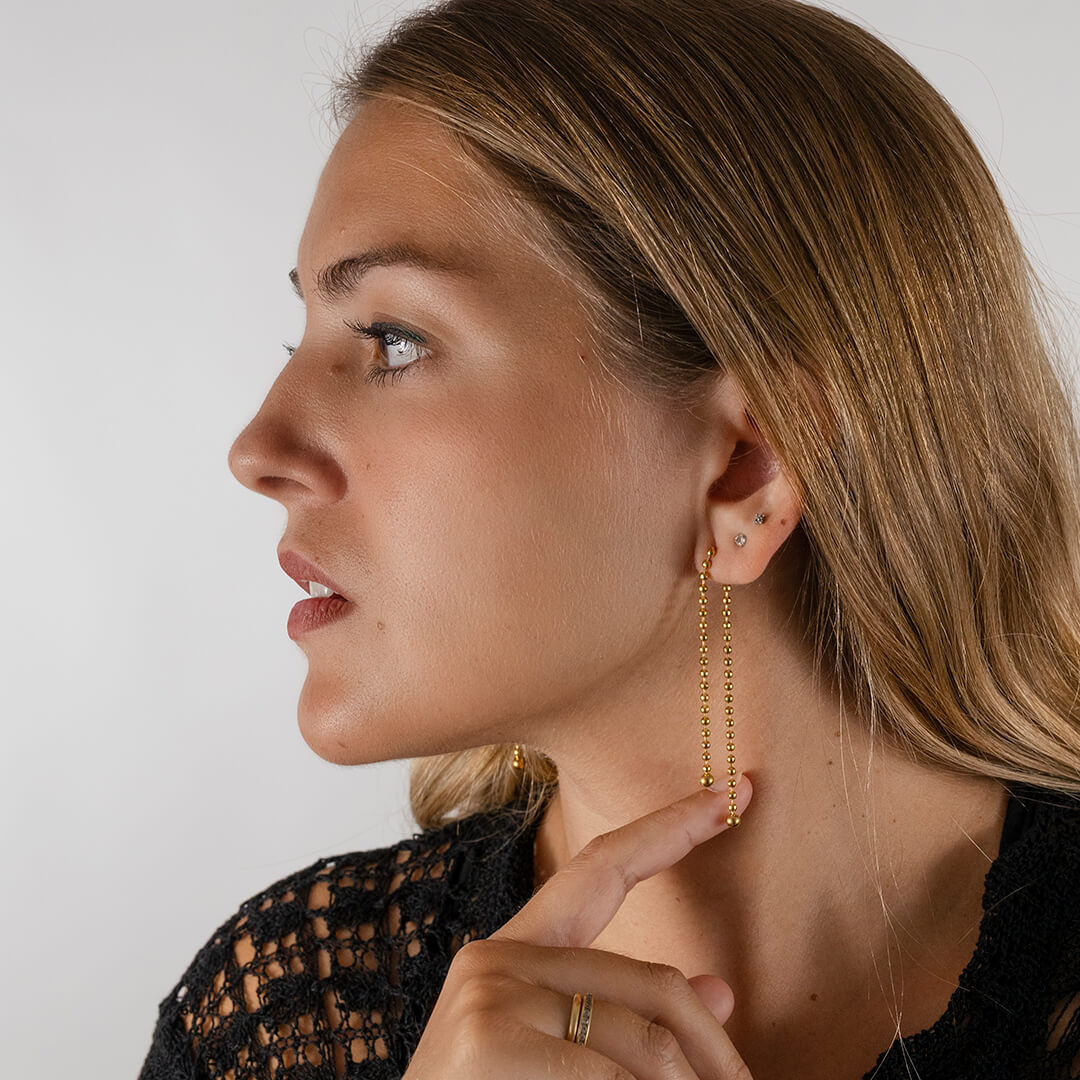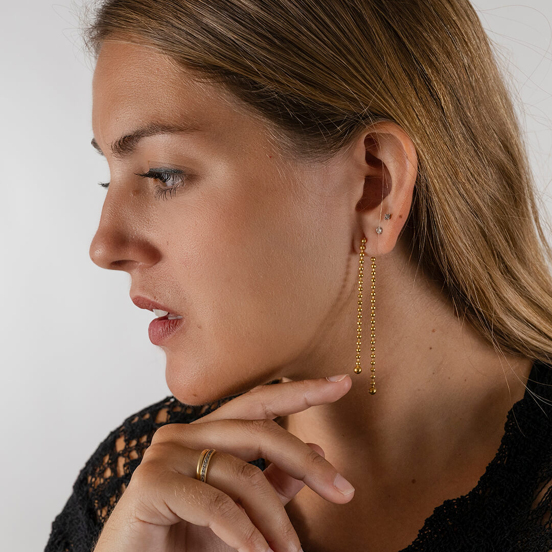 Pendientes largos de doble cadena en acero inoxidable dorado. Waterproof, hipoalergénicos y comodísimos, ideales para looks diarios o especiales.