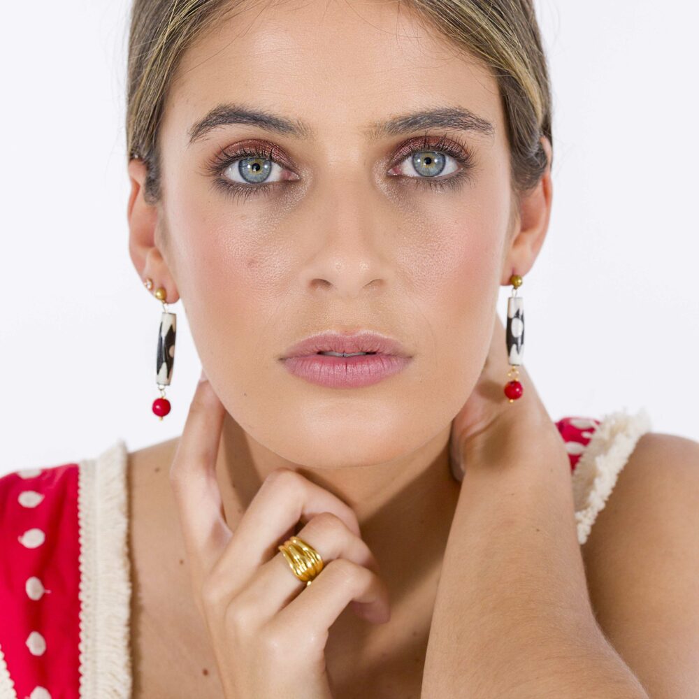 Si buscas unos pendientes con rollazo, diferentes y con historia, los Pendientes Nairobi son para ti. Estamos in love con este diseño montado a mano en nuestro taller con piezas auténticas traídas de África. Estos pendientes tienen como cabeza una bolita dorada que va pegada al lóbulo y, colgando de ella, un cilindro de hueso con manchas en blanco y marrón que no puede ser más especial. Para darle ese toque colorido y cultural que tanto nos gusta, cuelga de él una piedra redonda de coral natural en rojo.