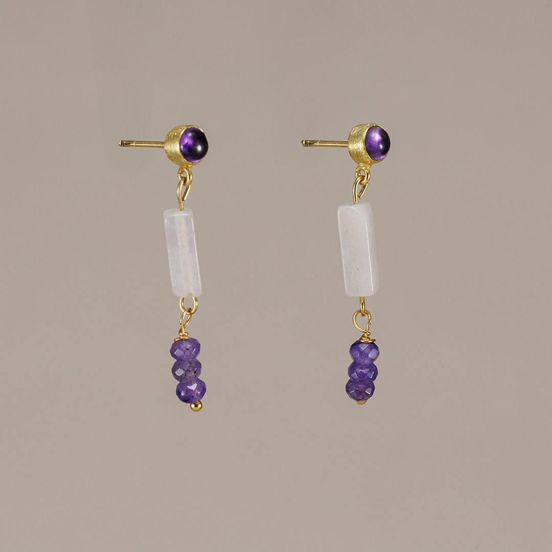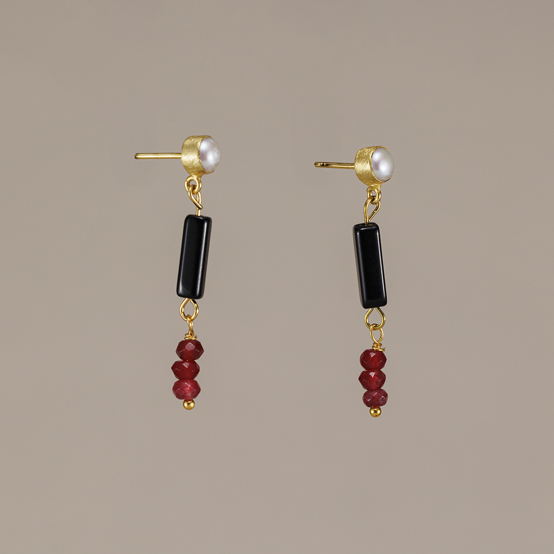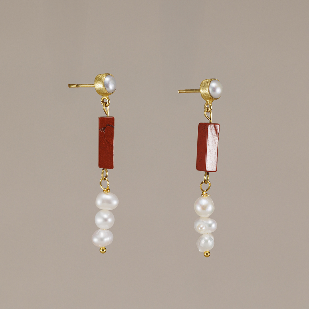 Puedes elegir entre distintas combinaciones: cabeza redonda bañada en oro con perla, amatista u ónix, barra cuadrada de cuarzo rosa, jaspe rojo u ónix, y final en mini piedras como perla de río, turmalina fresa o turmalina malva. Su cierre de mariposa los hace súper cómodos y perfectos para llevar todo el día.
