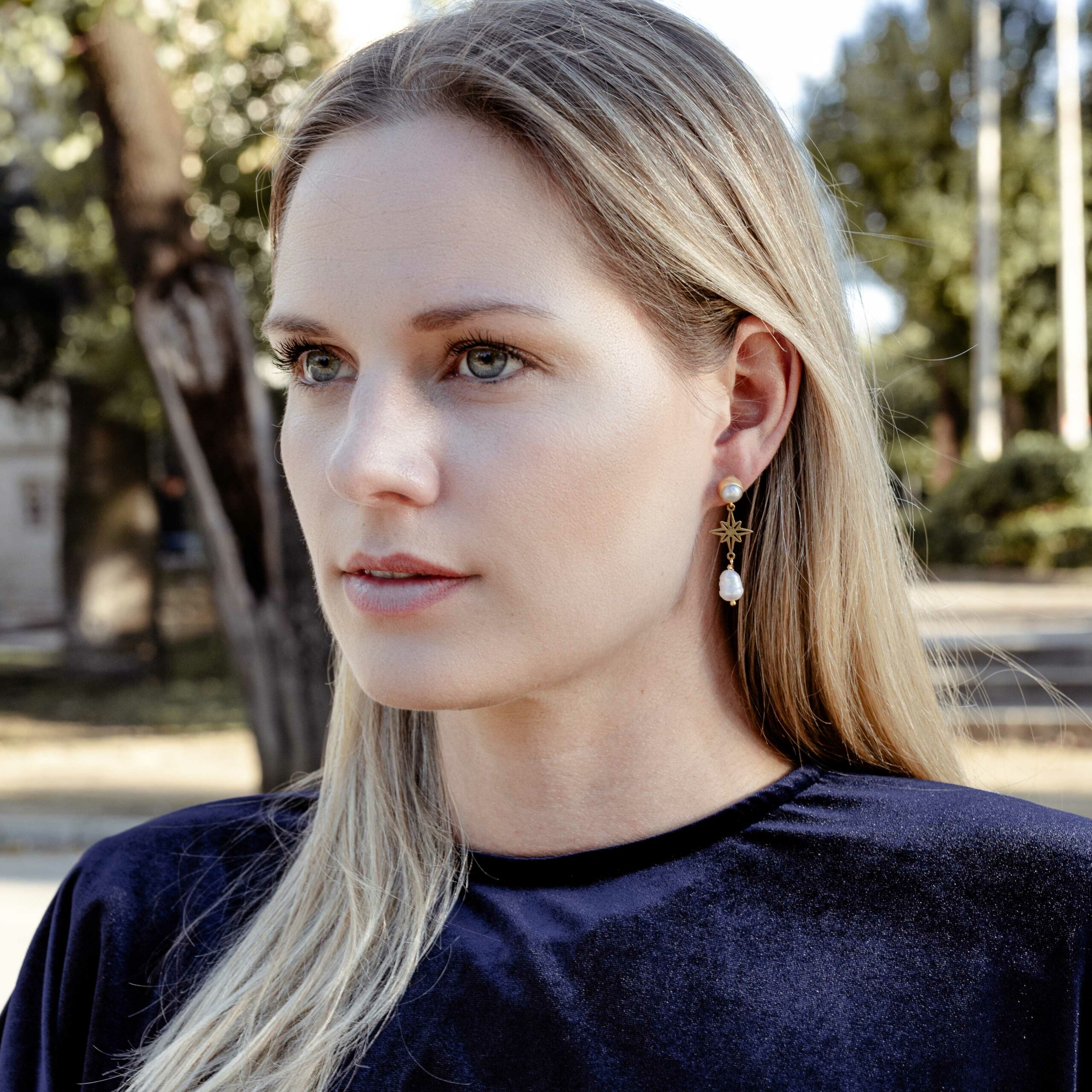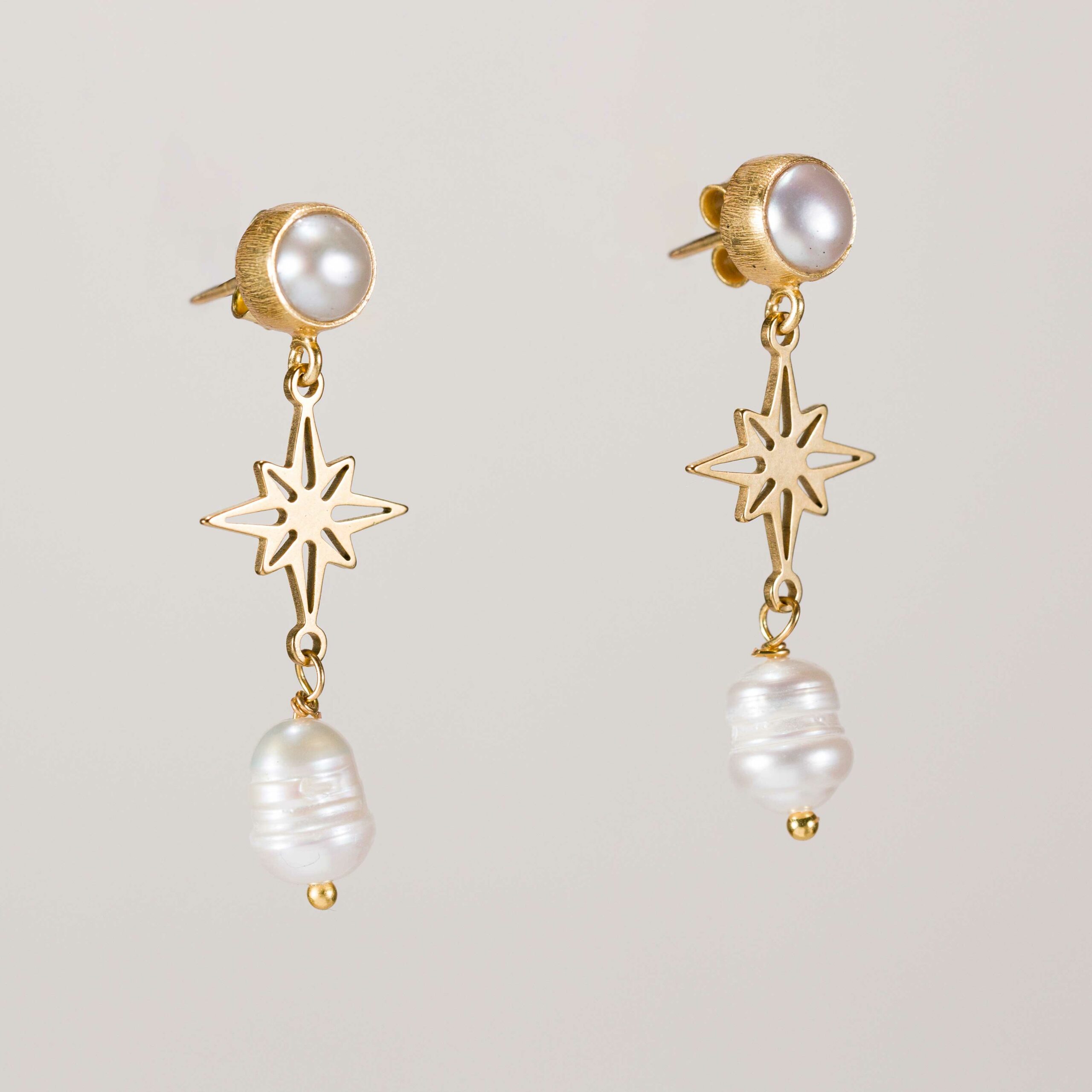 Los Pendientes Perlas Omega son el  nuevo diseño de la colección bridal de Darwin Collection. Fabricados en Plata 925 con un baño de oro de 18 quilates, y el diseño es tan único como especial. En la parte superior, lleva una perla blanca cultivada, rodeada de un aro dorado que le da un toque distintivo. Justo debajo, una pequeña estrella dorada añade un detalle romántico, y finalmente cuelga una hermosa perla natural de río, en un blanco luminoso que resalta con cualquier look.