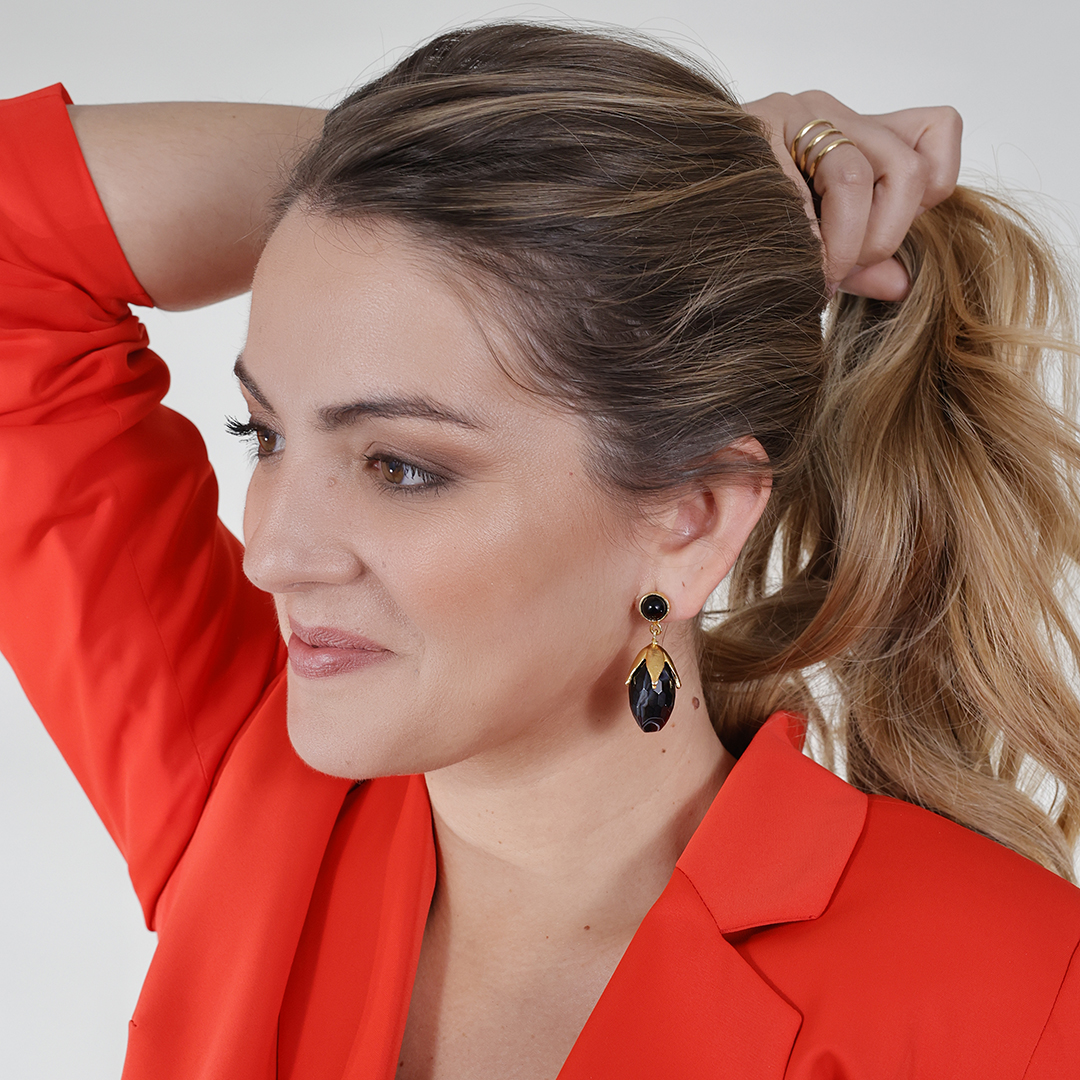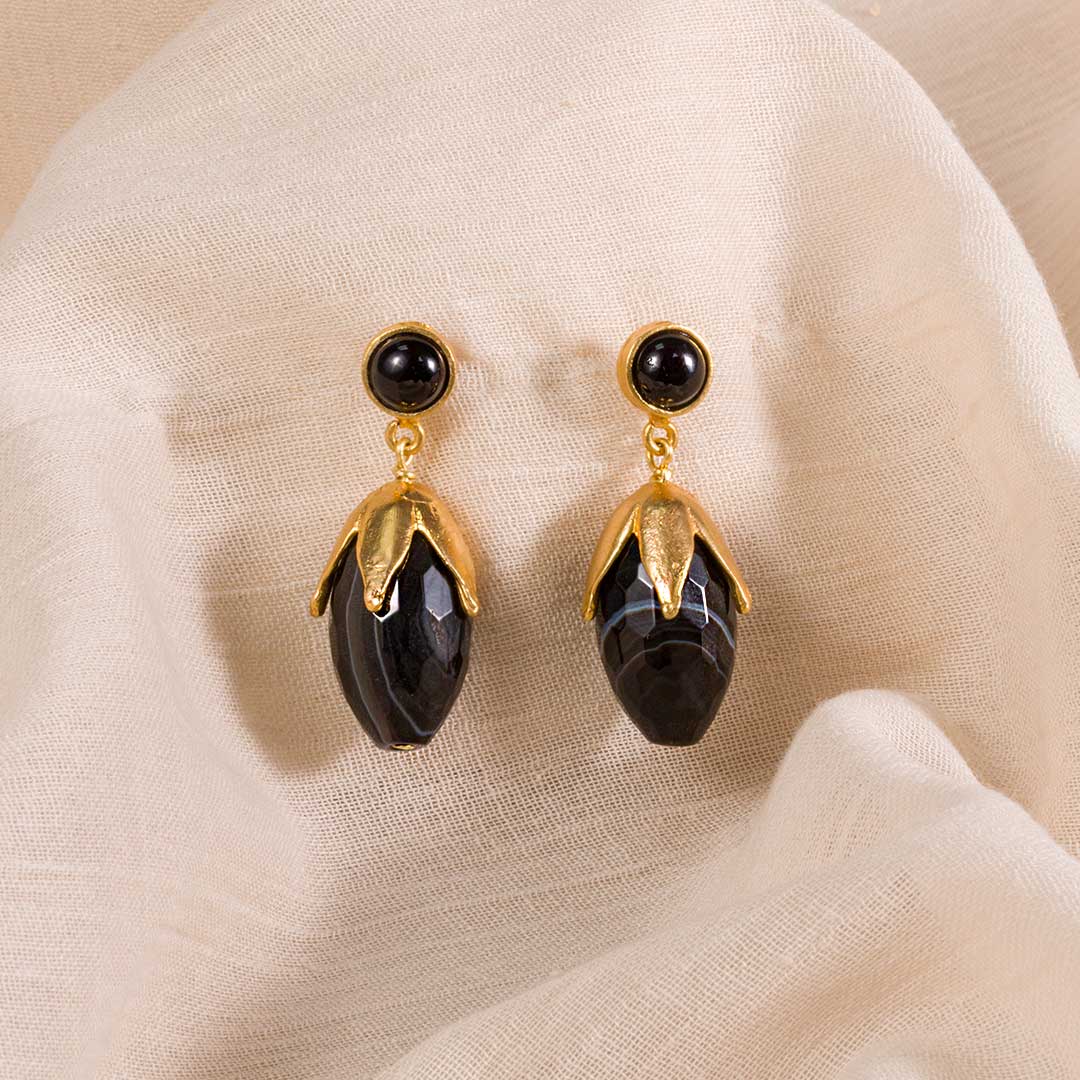 Estos pendientes están hechos con plata de ley 925 y bañados en oro de 18 quilates. La parte superior tiene una piedra redonda de ónix, como un botón dorado, ¡una combinación perfecta! Y luego cuelga una lágrima de ónix natural, sujetada como si fuera una flor en dorado. ¿No te parece romántico y cuidado?
