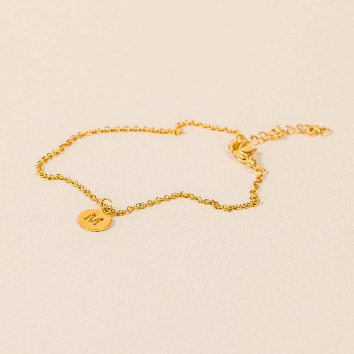 La Pulsera Invitada Pilar está montada en una cadena pilar dorada de acero inoxidable de la que puedes colgar cualquiera de nuestra chapa de inicial.