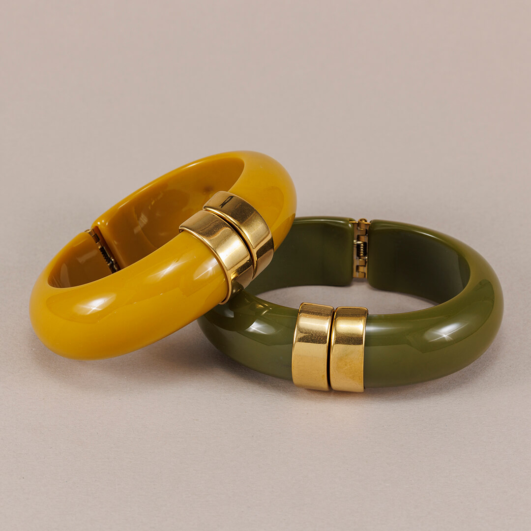 Pulsera Rígida Dijon en resina y acero inoxidable dorado. Disponible en verde y mostaza, resistente al agua y de estilo atemporal