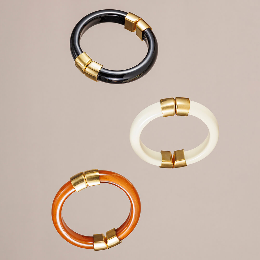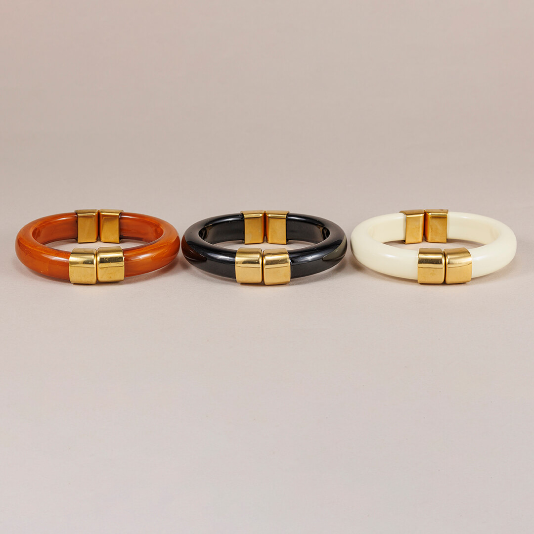 Pulsera Rígida Patricia en acero dorado y resina jaspeada. Atemporal, resistente al agua y disponible en negro, ámbar y blanco.