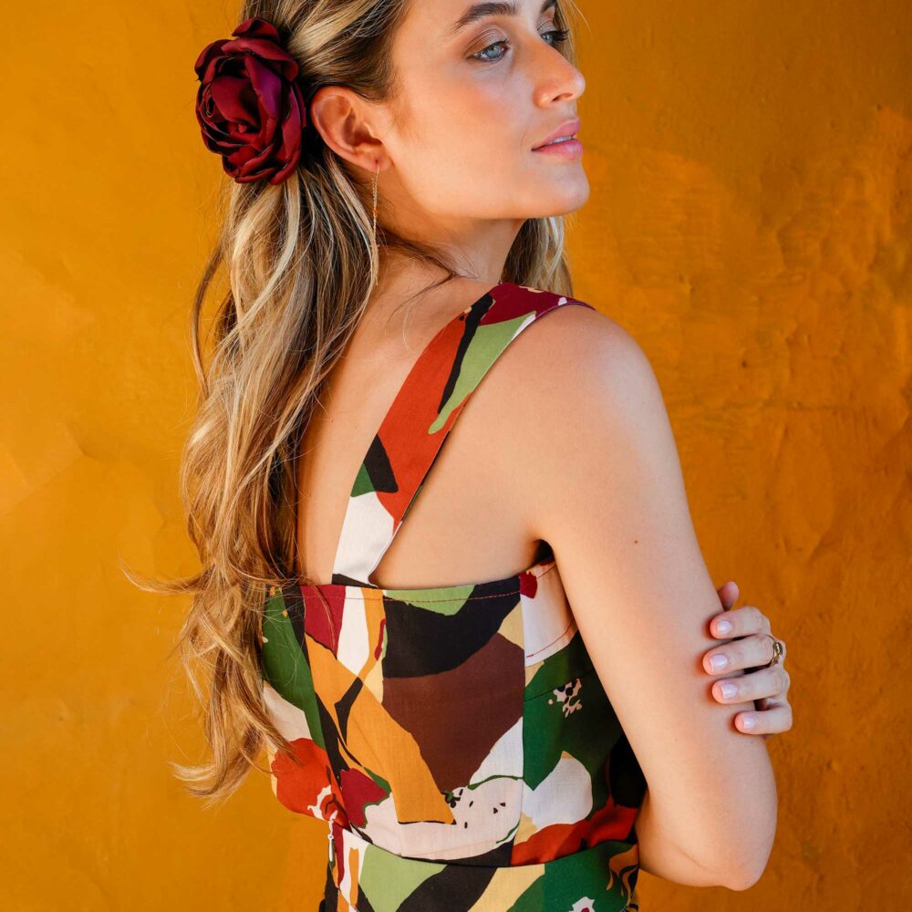 ¡Te presentamos el Top Pepita, directamente desde Sevilla y parte de nuestra recién estrenada Colección Palma de invitada! Este crop top es una auténtica joya, confeccionado en un fresco tejido de lino estampado. Los colores vibrantes como terracota y verde le dan ese toque mediterráneo ideal para los meses de verano, ¡te sentirás como en la costa!